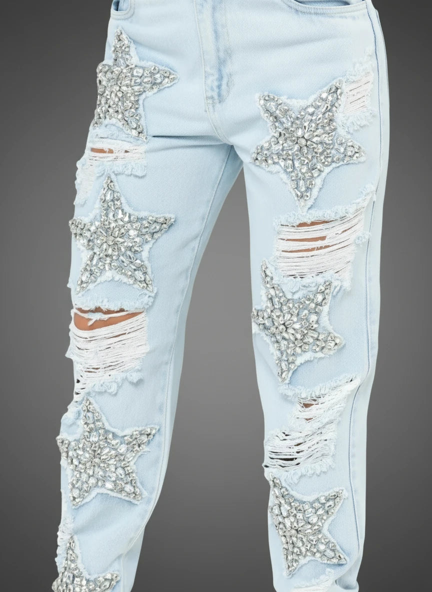 These star-studded boyfriend jeans bring that fearless SAS vibe—rhinestone shimmer, distressed detailing, and that perfect loose fit that says effortless confidence. Made from a premium cotton blend, they’re built to turn heads while keeping comfort first. Pair them with a cropped top or a fitted tee for that casual-but-badass look that never misses.