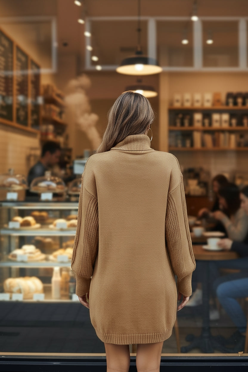 Warm, soft, and effortlessly stylish — this openwork turtleneck sweater dress blends cozy comfort with a chic, feminine shape. The ribbed texture adds dimension, while the slight stretch keeps the fit smooth and flattering.